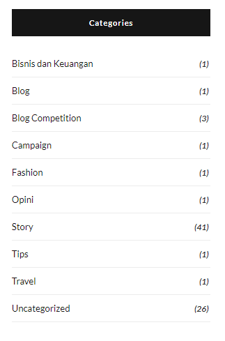 Itu adalah tampilan kategori yang ada di blog gue. Awalnya itu ada #CADELSTORY, 20’s Diary dan Daily Life. Awalnya ketiga kategori tersebut memiliki konsep tersendiri, seperti #CADELSTORY isinya cerita kehidupan gue yang tanpa huruf ‘R’, 20’s Diary yang isinya diary gue di umur 20 tahun, dan Daily Life yang isinya merupakan cerita sehari-hari. Menurut gue, konsep utama dari ketiga kategori itu memiliki persamaan, yaitu bercerita. Maka dari itu, gue memangkas kategori tersebut menjadi masuk ke Story aja. Lagi pula, enggak konsisten juga setiap kategori itu alias jarang nulis.