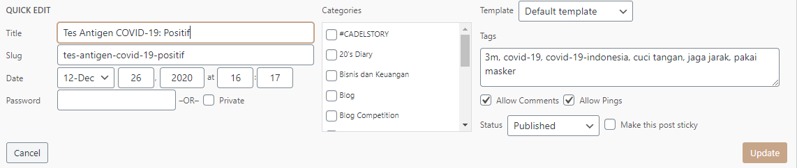 Kelima, pada bagian Categories, kalian bisa pilih mau ubah Categories atau kategori dari apa menjadi apa. Setelah itu, klik Update di pojok kanan bawah menu Quick Edit.