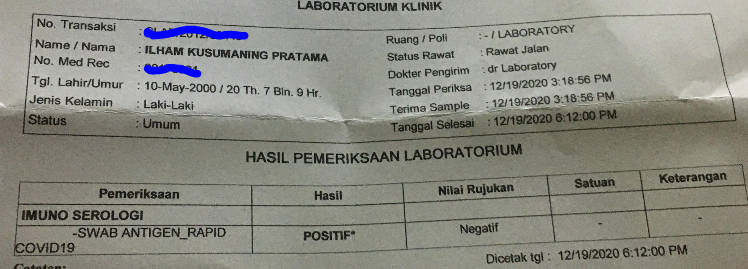 Tiga jam berlalu, gue menunggu di depan laboratorium untuk mendapatkan hasil. Nama gue pun dipanggil dan diberi amplop tetapi isinya bukan uang melainkan surat bahwa hasil swab antigen gue, POSITIF.